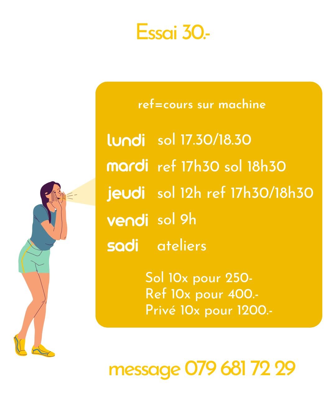What's app MESSAGE 079 681 72 29 pour réserver ton essai 30.- en indiquant quel cours (suivant l'horaire en bas de page)